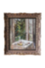 Antique oil painting on canvas of a woman serving a man in a tavern
